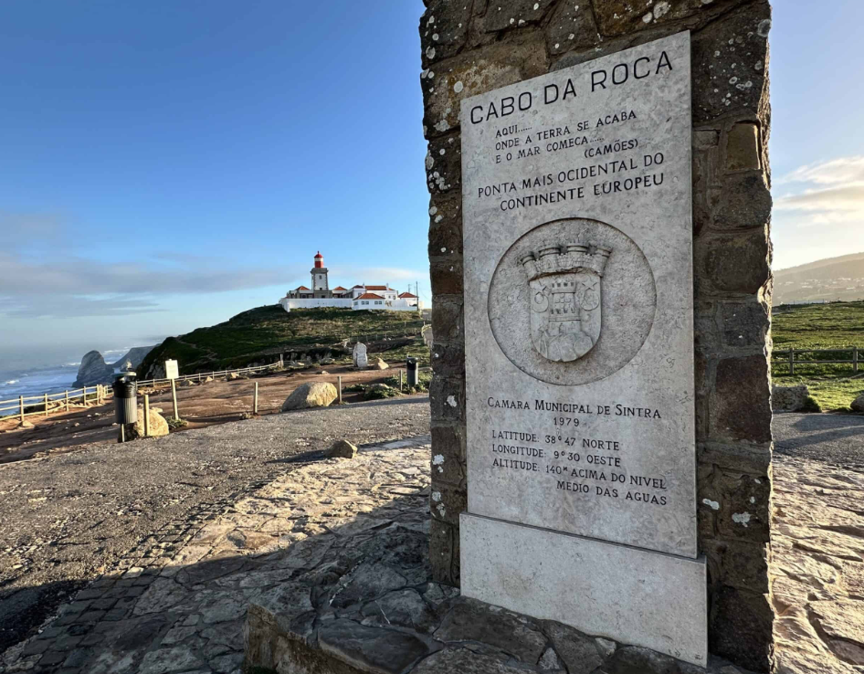 Questa frase è incisa sulla lapide del monumento in pietra posto sotto il faro: situato a 38°47‘ di latitudine nord e a 9° 30′ di longitudine ovest, Cabo da Roca è il punto più occidentale d’Europa. Si traduce letteralmente dallo portoghese come “Capo della Roccia”.