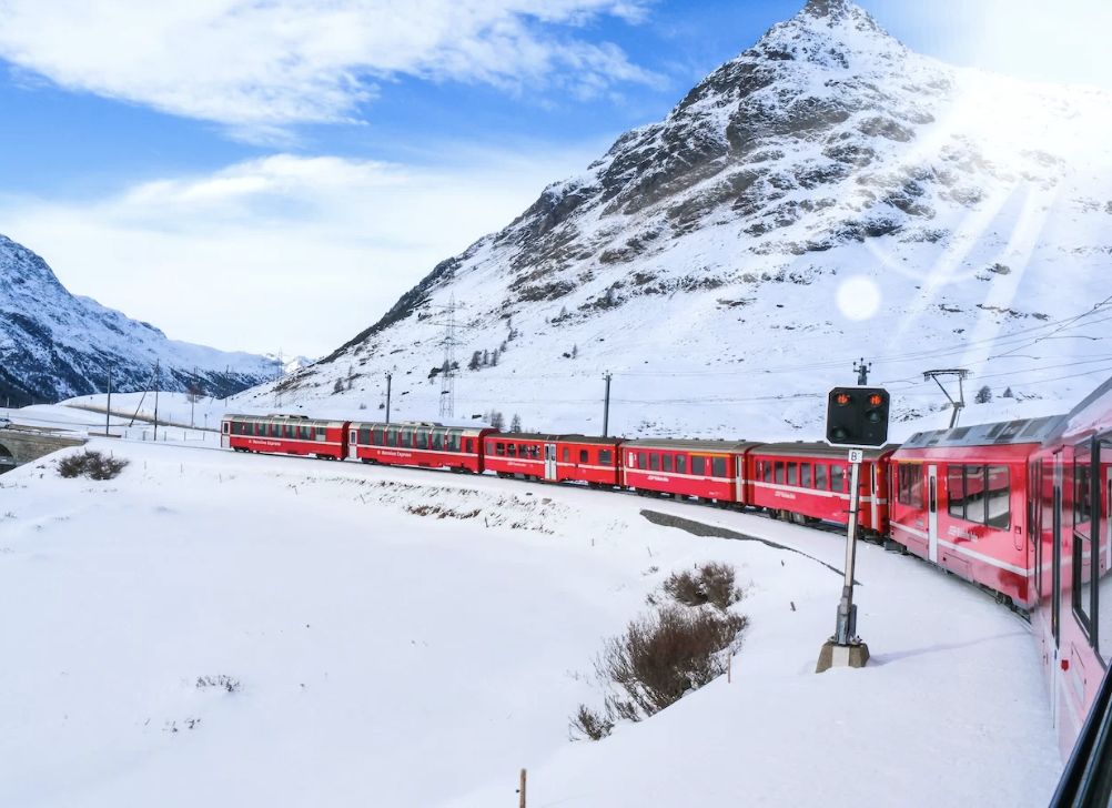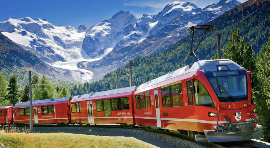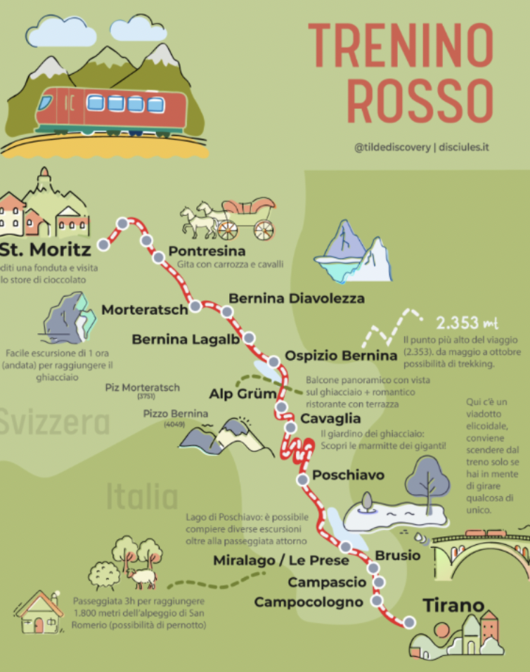 Il trenino del Bernina inizia il suo percorso da Tirano, in provincia di Sondrio in Lombardia, e termina a Saint Moritz, in Svizzera. Il viaggio senza soste dura circa due ore e mezza. Chi vuole, invece, può scendere nelle varie fermate e poi aspettare il trenino successivo.