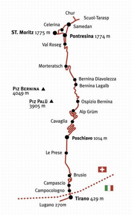 Le fermate sono queste: Tirano (429 m.) – Viadotto elicoidale di Brusio – Miralago – Le Prese – Poschiavo – Alp Grüm (2.091 m.) – Ospizio Bernina (2.253 m.) – Bernina Diavolezza (2.082 m.) – Morteratsch (1.893 m.) – Pontresina (1.774 m.) – St. Moritz (1.775 m.)